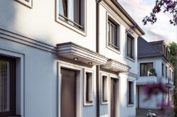 Das unterstreichen unter anderem die Walmdach-Architektur, aufwendige Fassadengliederungen und Faschenstrukturen, große Fensterflächen, die geschmackvolle Farbgestaltung sowie ein hochwertiges Materialkonzept.
