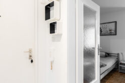 Im Eingangsbereich wurde durch ein praktisches Schiebetürelement eine Garderobe sowie eine kleine Abstellnische geschaffen. Das modernisierte Badezimmer verfügt nun neben einer Dusche auch über einen Waschmaschinenanschluss.